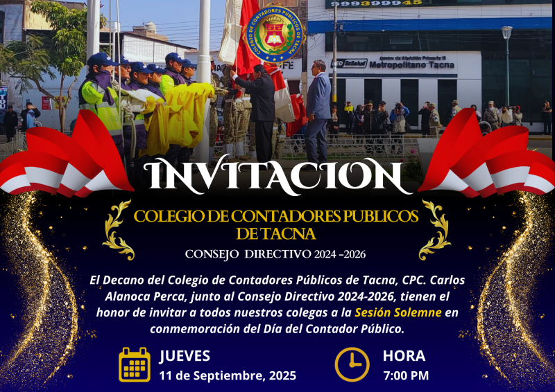 El Decano del Colegio de Contadores Públicos de Tacna, CPC. Carlos Alanoca Perca, junto al Consejo Directivo 2024-2026, tienen el honor de invitar a todos los colegas a participar en la Sesión Solemne en conmemoración del Día del Contador Público.