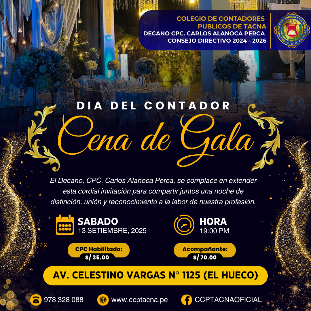 El Colegio de Contadores Públicos de Tacna, presidido por nuestro Decano CPC. Carlos Alanoca Perca, tiene el honor de invitar a todos los agremiados a la Cena de Gala por el Día del Contador.