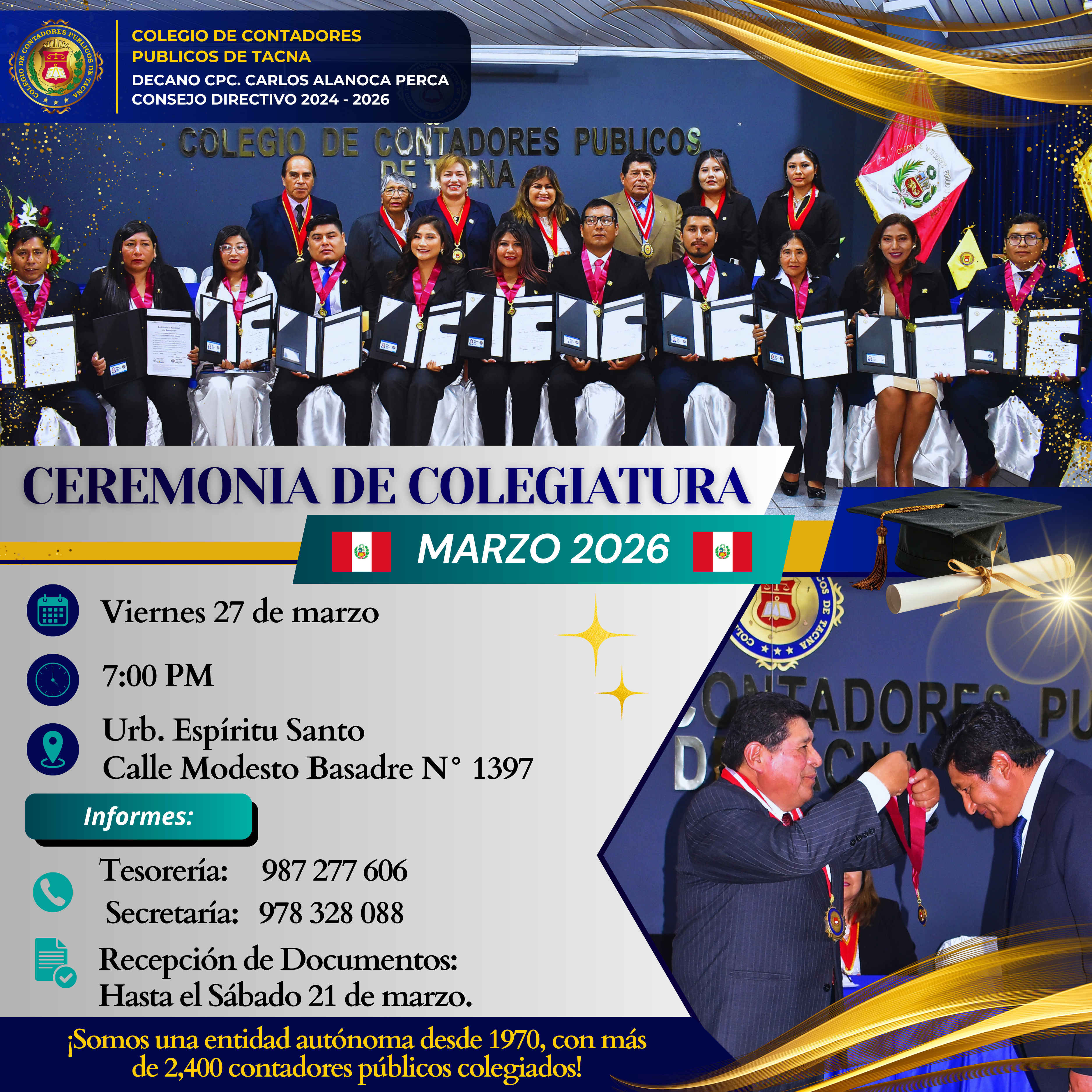 El Colegio de Contadores Públicos de Tacna, bajo el liderazgo de nuestro decano CPC. Carlos Alanoca Perca, te invita a formar parte de una institución sólida, con visión de futuro y comprometida con el desarrollo de la profesión contable.